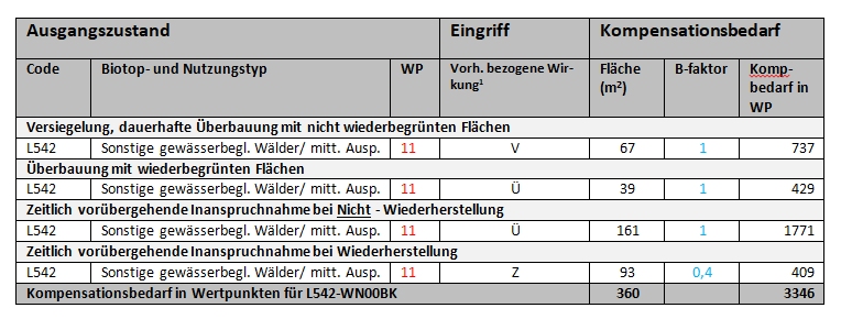 Die Bayerische Kompensationsverordnung erfordert für die Eingriffs- und Kompensationsermittlung die Anwendung des Biotopwert-verfahrens. Der Kompensationsbedarf für die Einzelflächen wird ermittelt aus der Verschneidung der kartierten Biotop- und Nutzungstypen mit den von der Planung ausgehenden vorhabens- bezogenen Wirkungen.